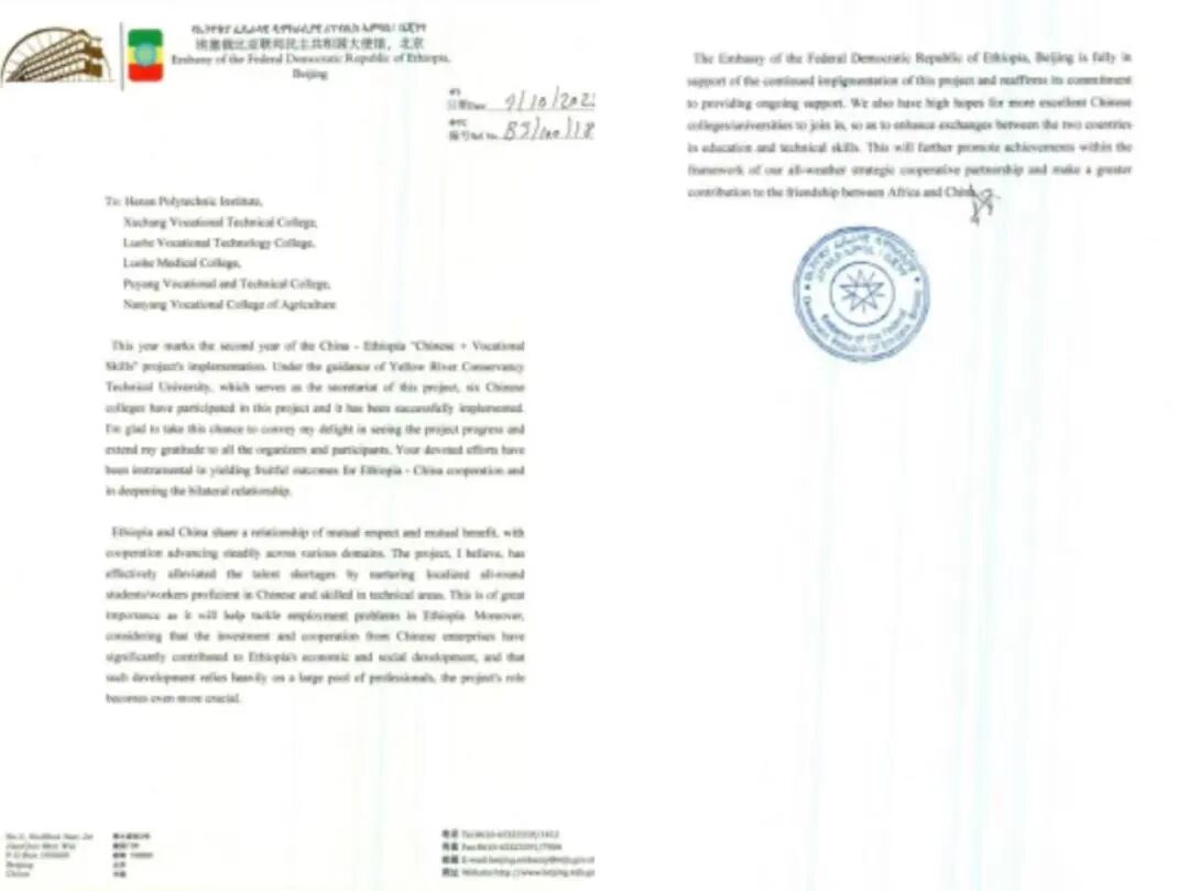 近日,漯河职业技术学院收到了来自埃塞俄比亚联邦民主共和国驻华大使馆发来的感谢信,使馆对我校在中文+职业技能项目中发挥的重要作用以及取得的成果给予高度评价,这是我校职业教育国际化工作获得国际认可的重要体现,也是我校落实一带一路倡议下教育互联互通的生动实践。